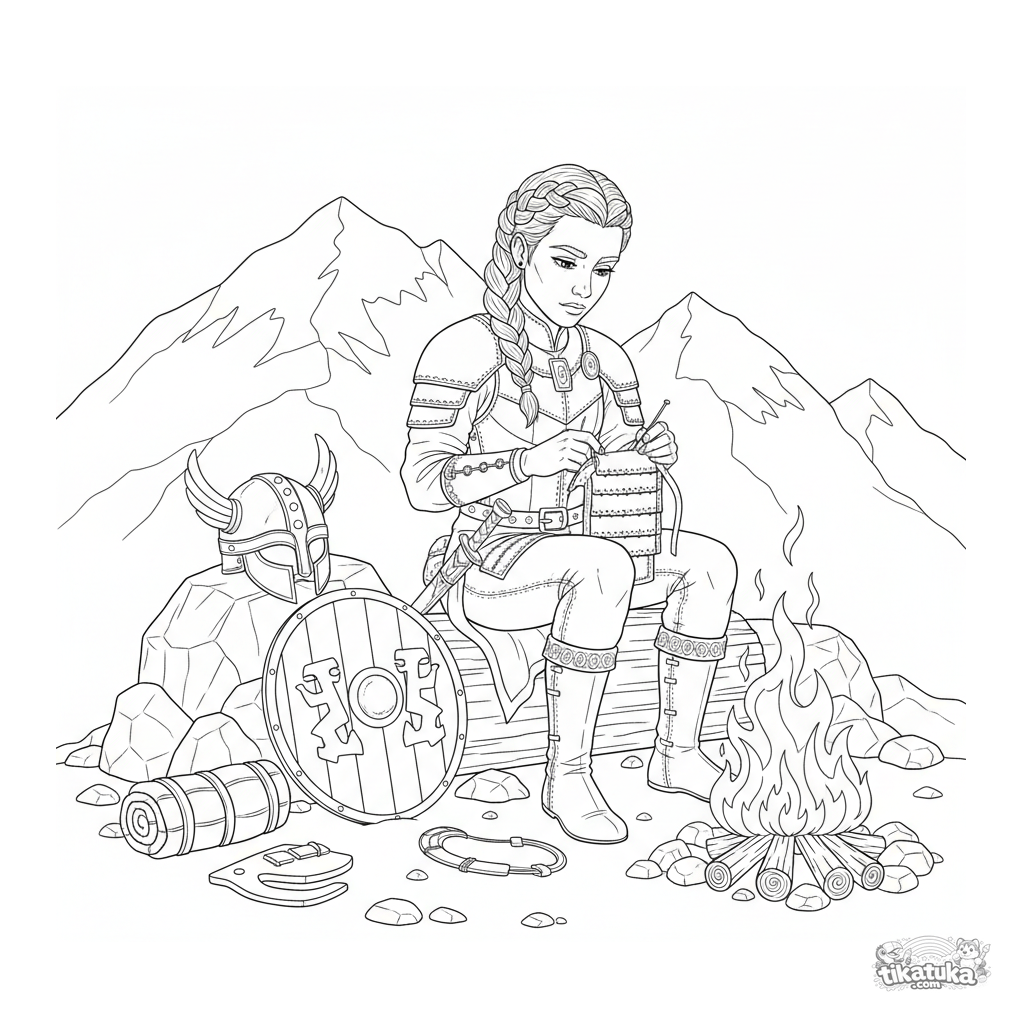 Página para colorir para crianças mais velhas 10-12: uma princesa guerreira conserta sua armadura junto a uma fogueira em um acampamento base na montanha. Cena realista detalhada.