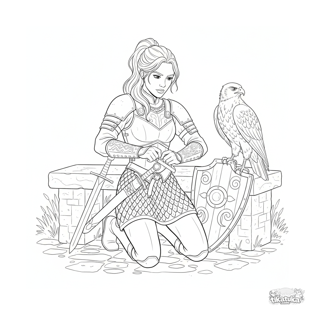 Página detalhada para colorir para crianças mais velhas 10-12: uma princesa guerreira conserta sua armadura no pátio de um castelo.
