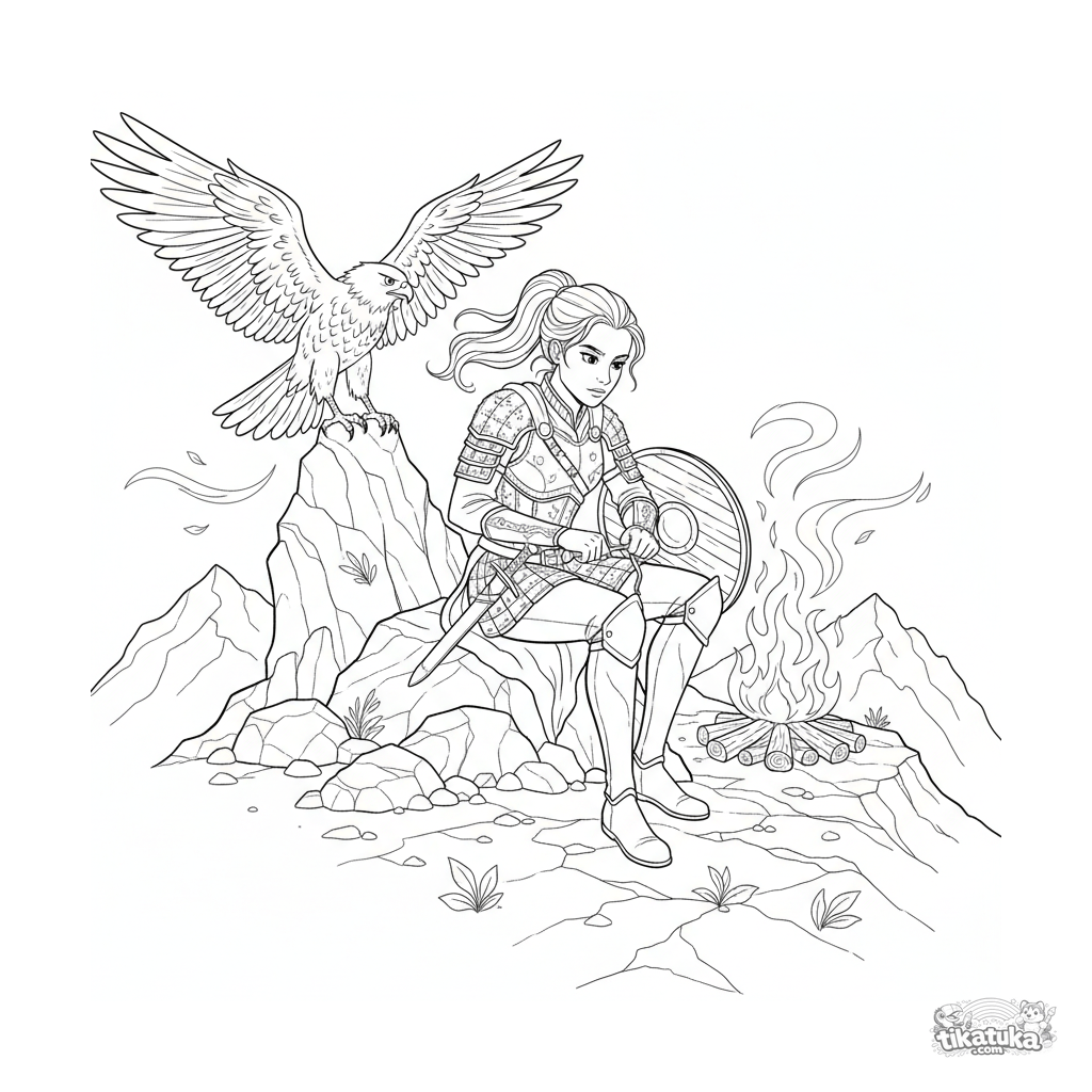 Página para colorir para crianças mais velhas 10-12: uma princesa guerreira conserta seu escudo junto a uma fogueira no pico de uma montanha. Cena detalhada com um falcão.
