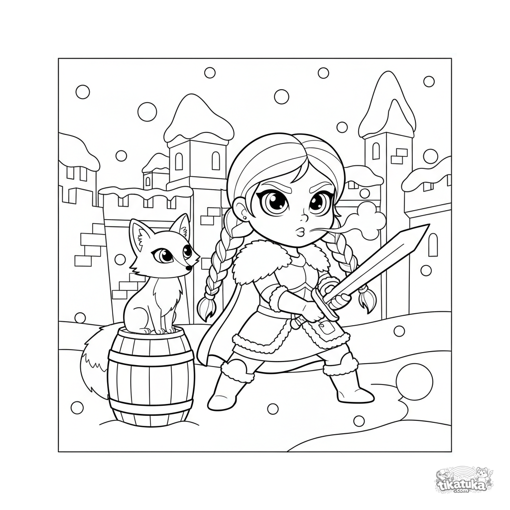Página para colorir para crianças 7-9: uma princesa guerreira treina com uma espada em um pátio nevado, observada por uma raposa. Cena de inverno dinâmica.