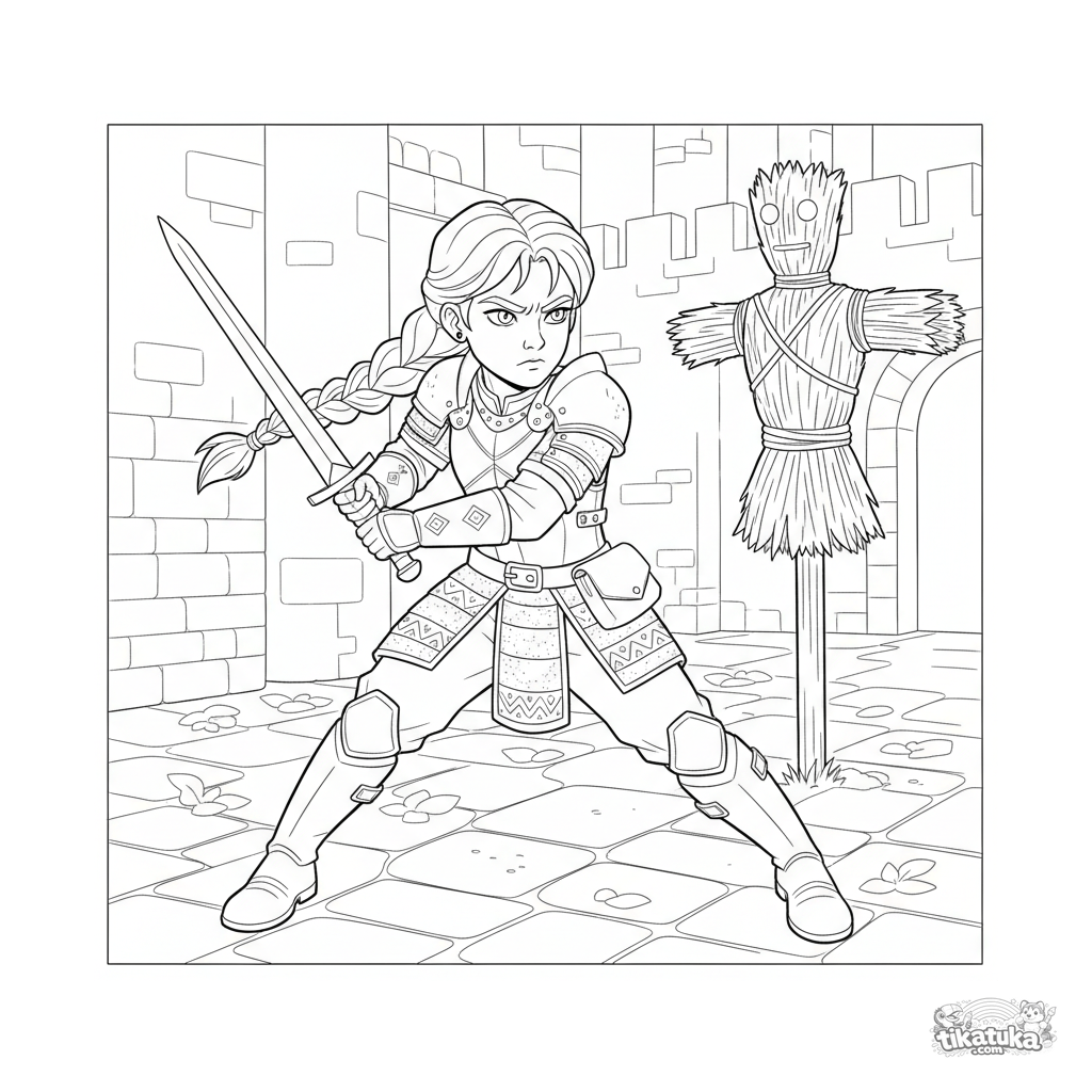 Página detalhada para colorir para crianças 10-12: uma princesa guerreira treina com uma espada de madeira no pátio de um castelo. Armadura prática, um boneco de treino de palha.