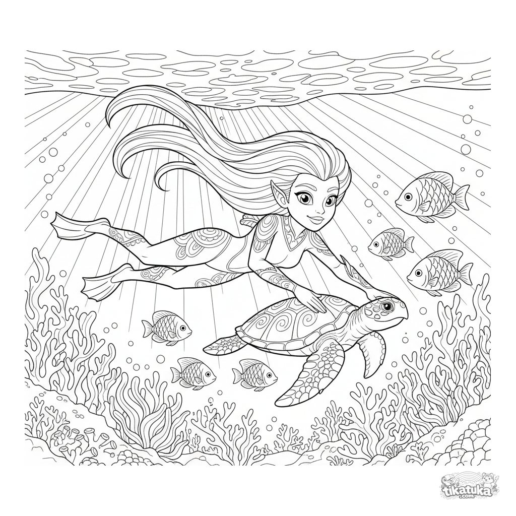 Página para colorir para crianças mais velhas 10-12: um super-herói com poderes aquáticos explora um recife de coral colorido e ajuda uma tartaruga marinha.