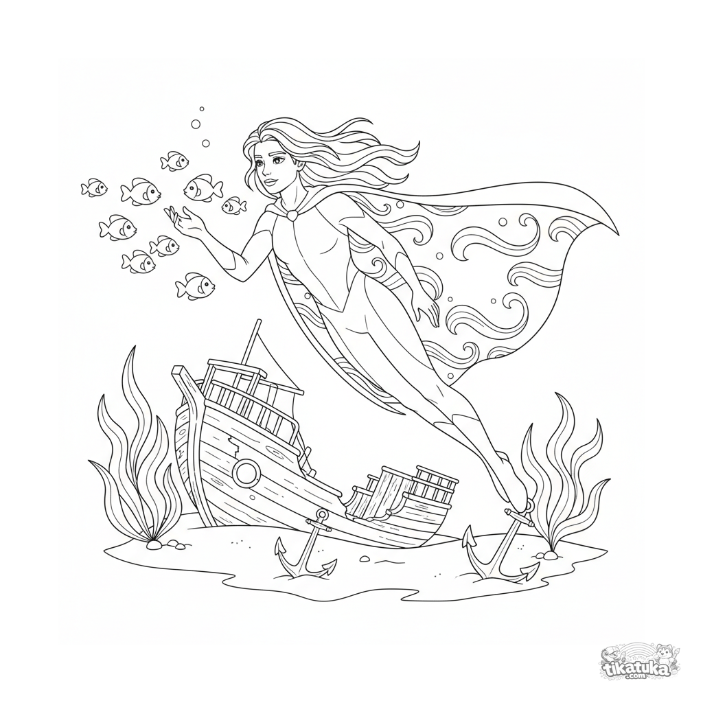 Página para colorir para crianças 7-9: um super-herói da água nada por um recife de coral perto de um navio naufragado. Cena de exploração submarina.