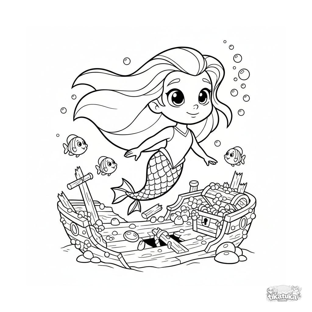 Página para colorir para crianças 4-6: um super-herói aquático em traje de escamas explora um navio naufragado entre peixes e tesouros. Cena de aventura subaquática.