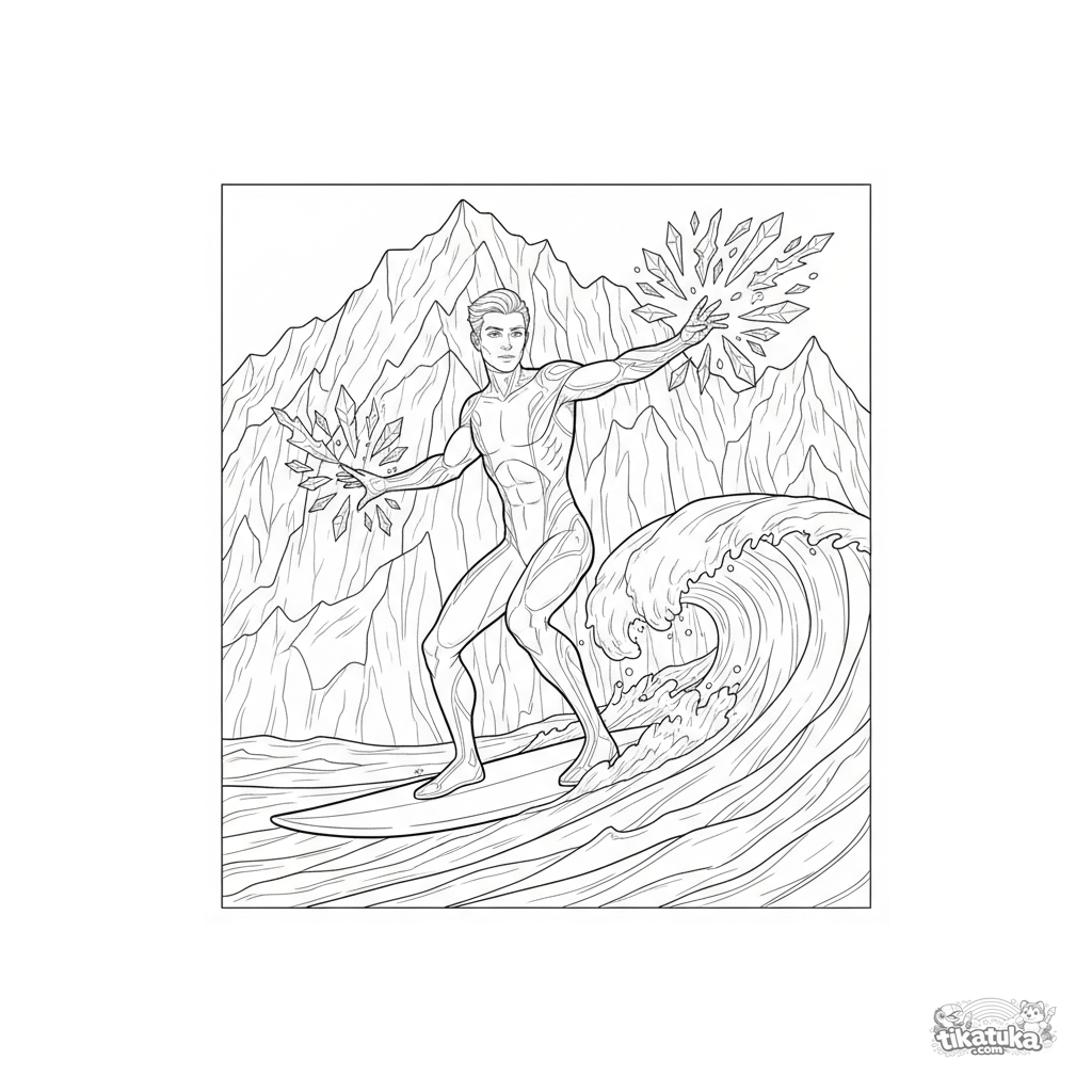 Página para colorir para 10-12 anos: um super-herói de água e gelo surfa em uma onda congelada perto de uma geleira ártica, criando cristais de gelo. Cena detalhada estilo gravura.