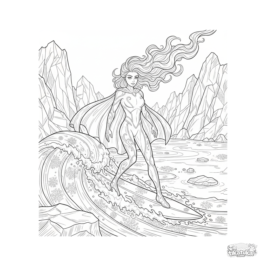 Página para colorir detalhada para 10-12 anos: um super-herói de água e gelo surfando em um lago glacial congelado, criando padrões intrincados de geada.