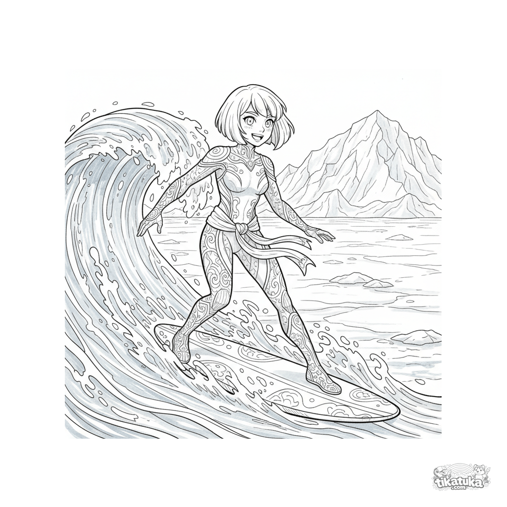 Página para colorir estilo aquarela para 10-12 anos: um super-herói aquático surfa uma onda líquida na superfície de um lago ártico congelado perto de uma geleira. Cena pitoresca e detalhada.