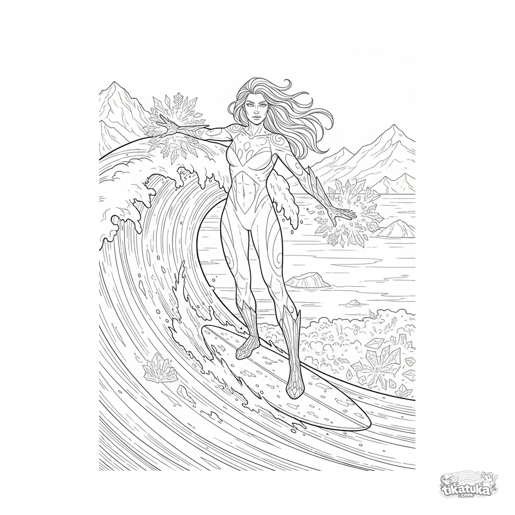Página para colorir para crianças mais velhas 10-12: um super-herói com poderes de água e gelo surfa em uma onda congelada em um lago gelado.