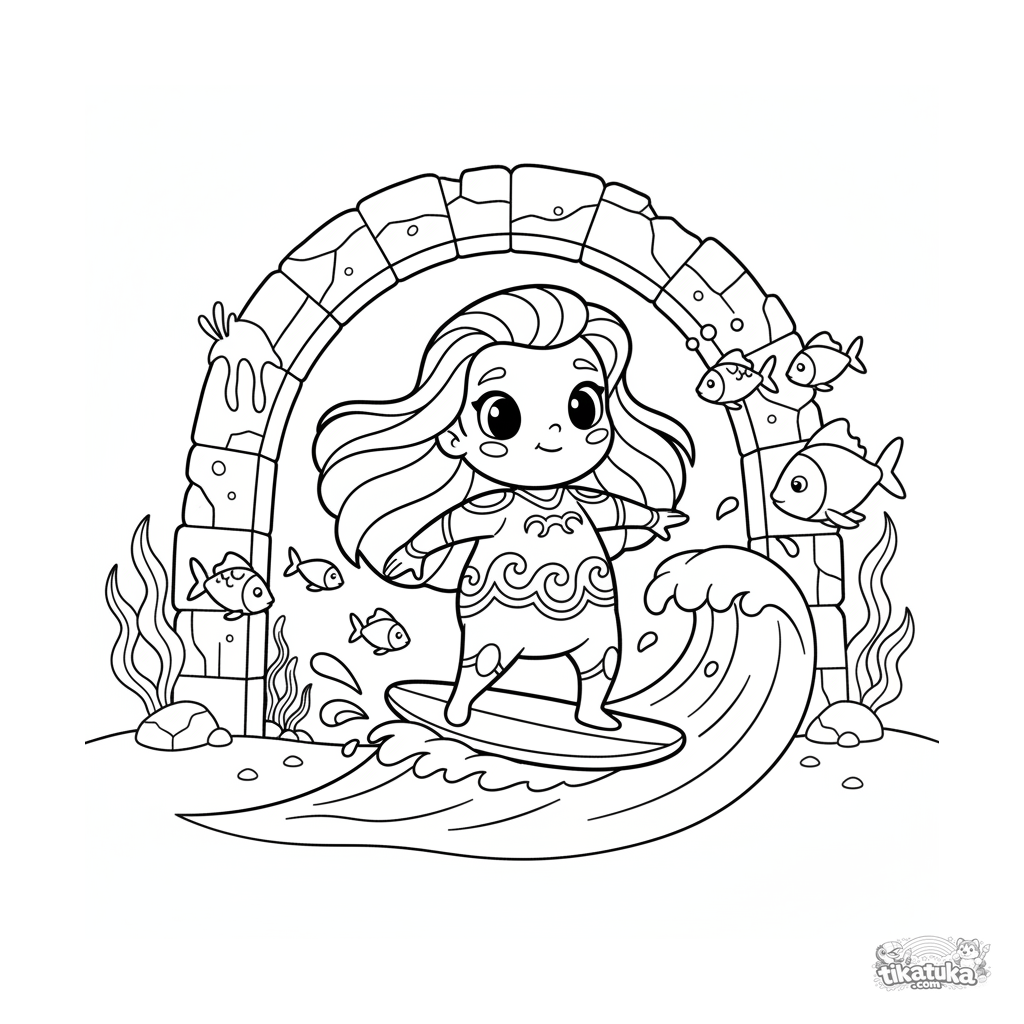 Página para colorir para crianças de 4-6 anos: um super-herói água surfa em uma onda entre arcos de pedra subaquáticos, com peixes nadando por perto.