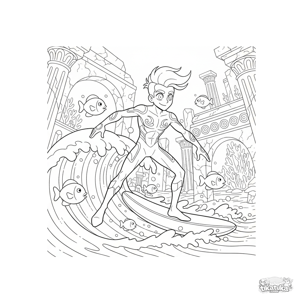 Página para colorir para crianças mais velhas 10-12: um super-herói que controla a água surfa uma onda entre os arcos de uma cidade antiga submersa.
