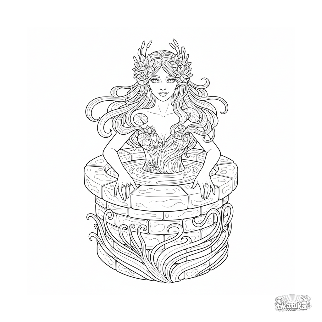 Página detalhada para colorir para crianças 10-12: uma ninfa da água em estilo art nouveau emerge do poço de água viva. Trabalho de linha intrincado, lírios d'água, cabelo e formas de água fluidos.