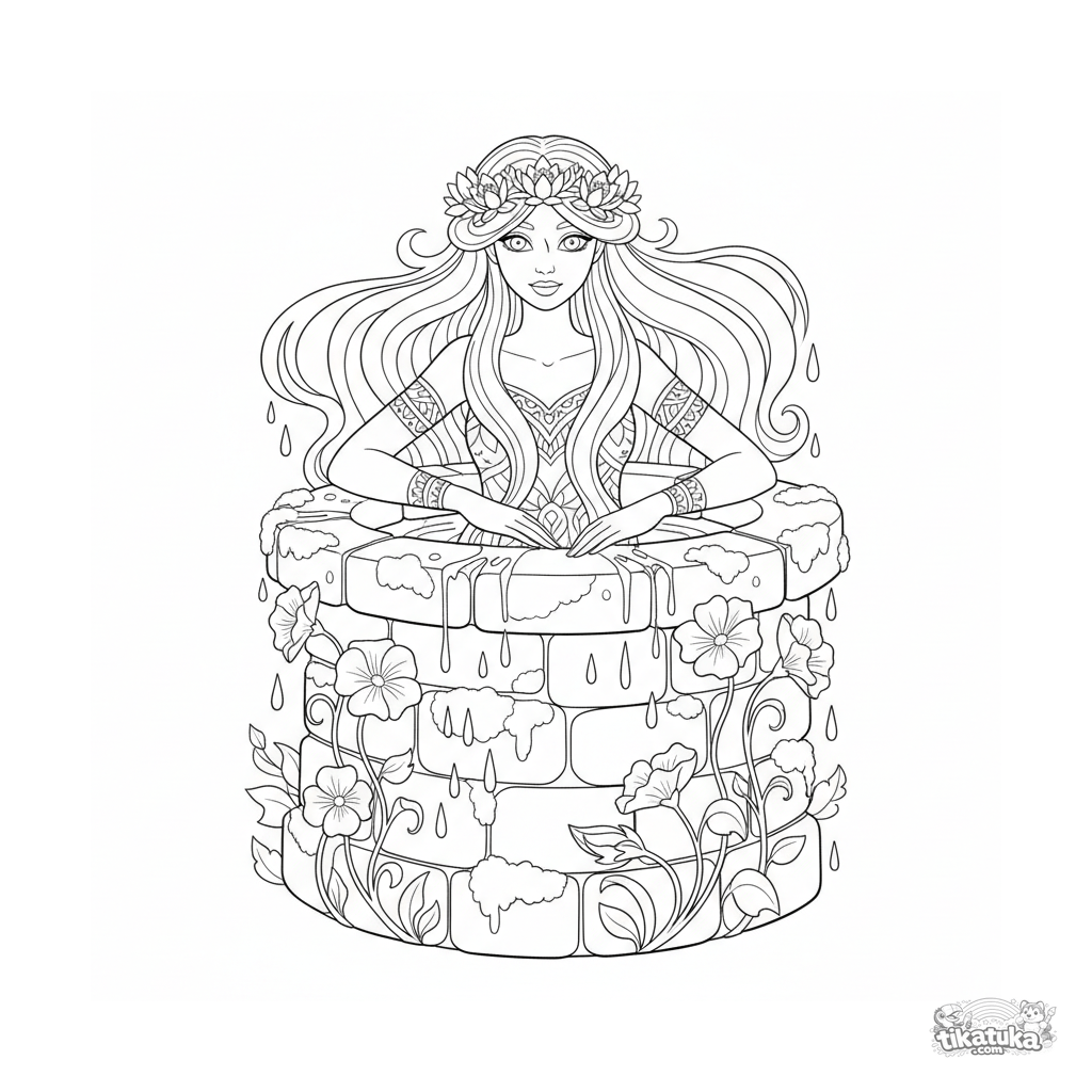 Página complexa para colorir para crianças mais velhas 10-12: um espírito da água rusalka emerge do poço de água viva. Linhas fluidas Art Nouveau, cabelo e plantas detalhados.