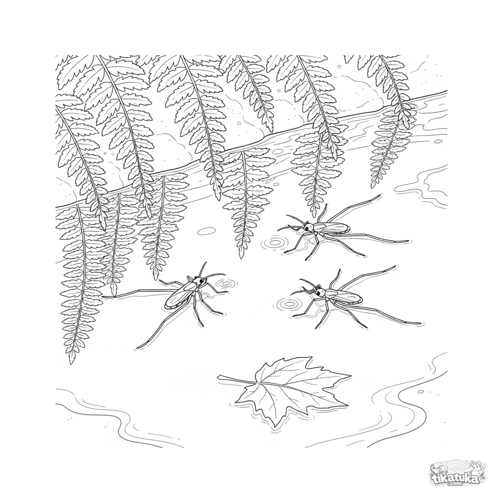 Página para colorir intrincada para crianças mais velhas de 10 a 12 anos: insetos patinadores detalhados deslizam na superfície calma de um riacho. Detalhes anatômicos.