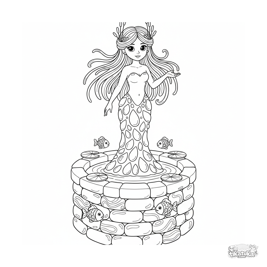 Página para colorir detalhada no estilo Art Nouveau para 10-12 anos: um espírito da água bondoso emerge do poço de água viva. Linhas fluidas, elementos decorativos.