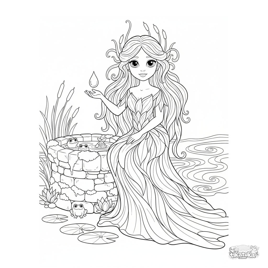 Página para colorir para pré-adolescentes 7-9: um espírito da água guardião no poço de água viva. Linhas fluidas no estilo art nouveau, atmosfera folclórica mágica.