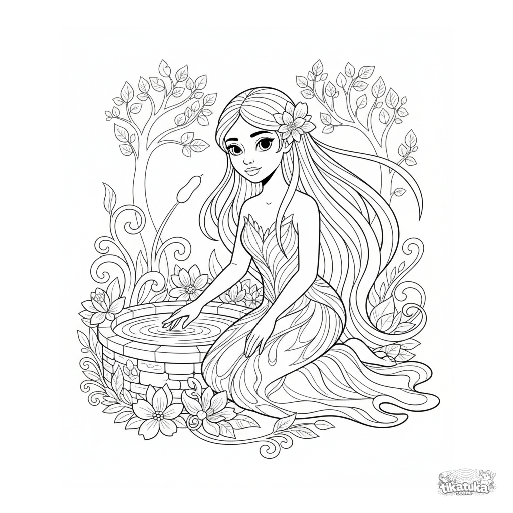 Página para colorir para 7-9 anos: uma donzela graciosa do espírito da água junto ao poço de água viva. Linhas fluidas, motivo folclórico, detalhe moderado.