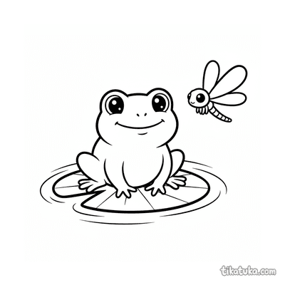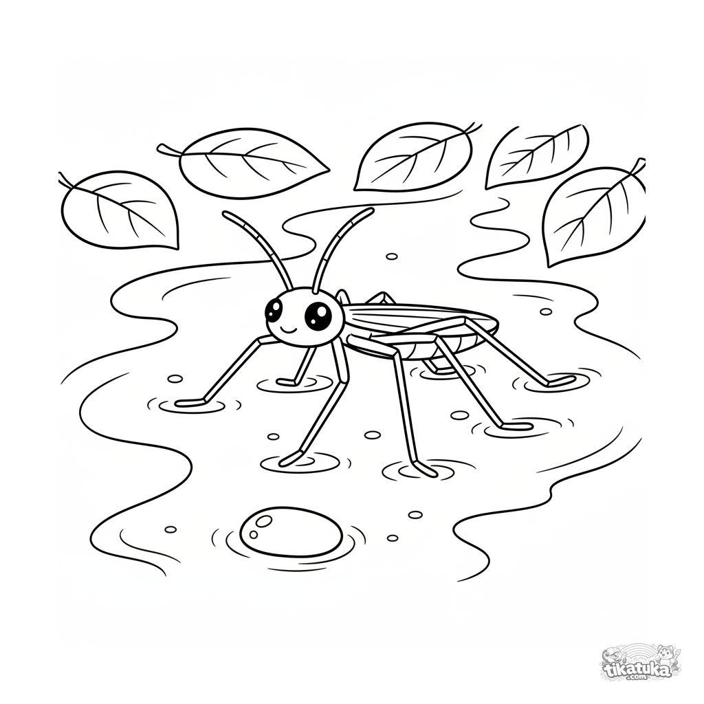 Página para colorir para crianças 4-6 anos: um inseto alfaiate deslizando na superfície de um riacho. Cena geométrica estilizada com formas simples.
