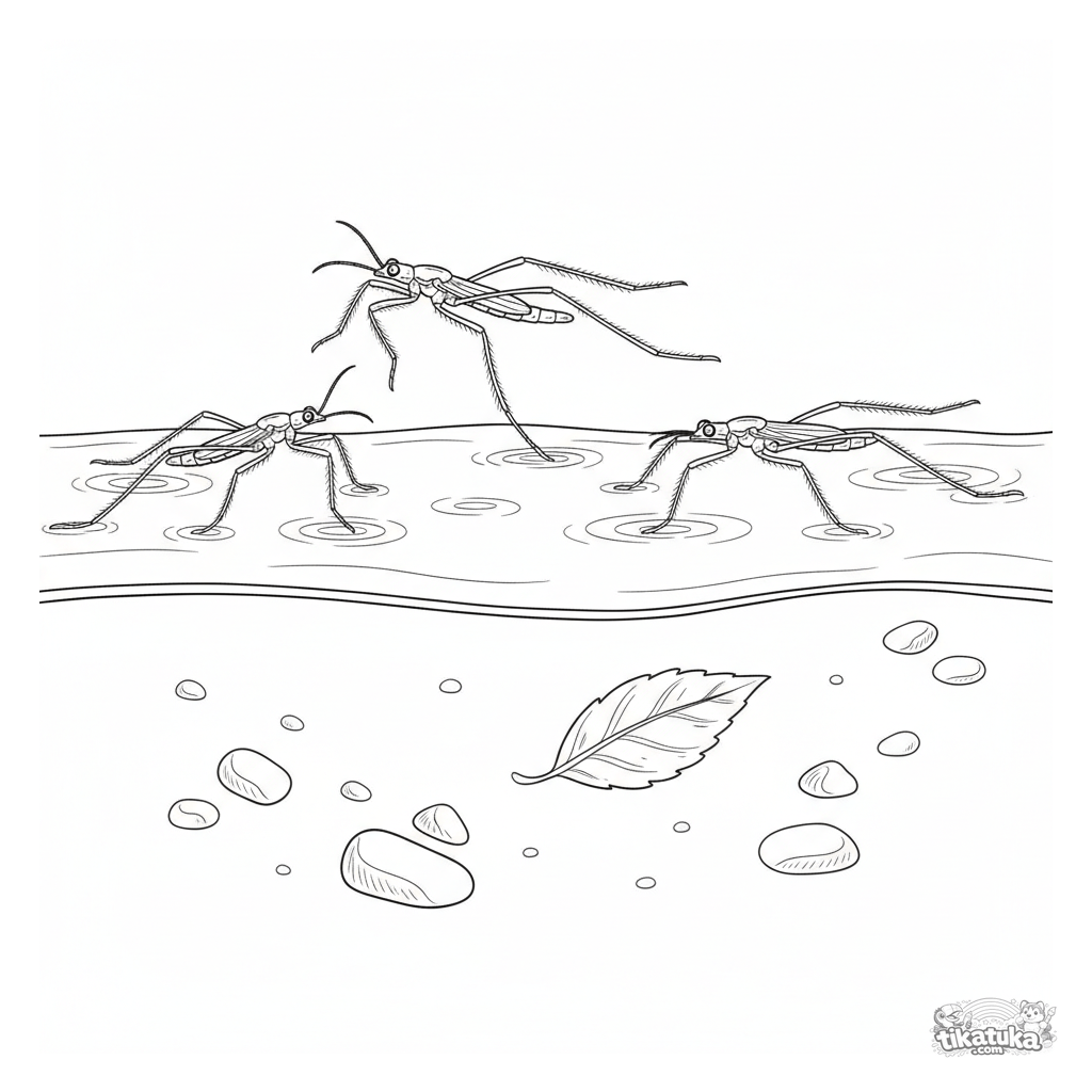 Página complexa para colorir para crianças 10-12: insetos alfaiate patinando na superfície de um riacho claro. Ilustração detalhada de inseto em estilo gravura.