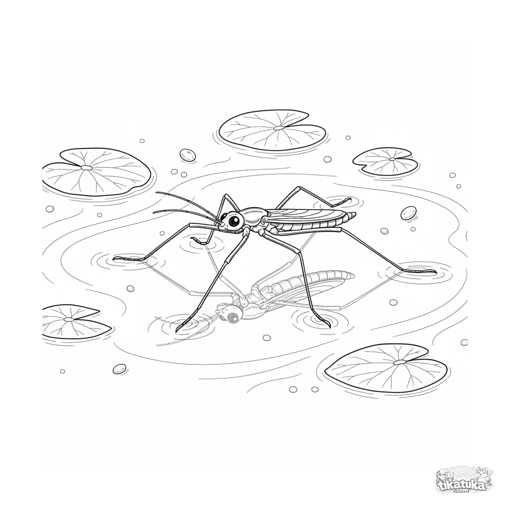 Página para colorir detalhada para crianças 10-12: um inseto alfaiate fica na tensão superficial de um riacho claro. Estilo de gravura vintage, detalhes anatômicos precisos.