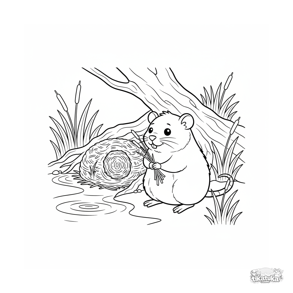 Página para colorir para crianças 7-9: um determinado rato-d'água construindo ativamente um ninho de junco na margem de um riacho claro no outono.