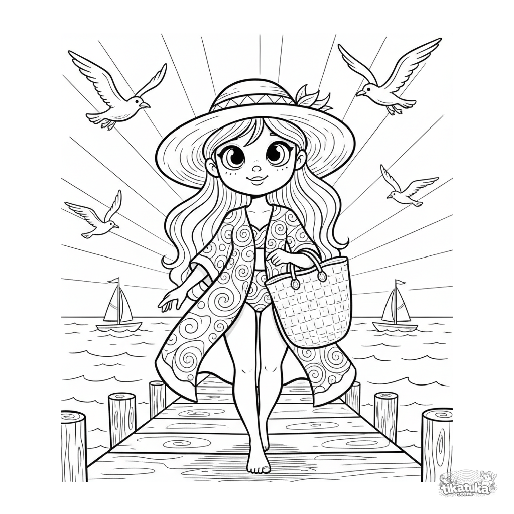 Página para colorir estilo esboço aquarela para meninas 10-12: uma garota com roupa de praia caminha em um píer de madeira ao pôr do sol, com gaivotas e veleiros.