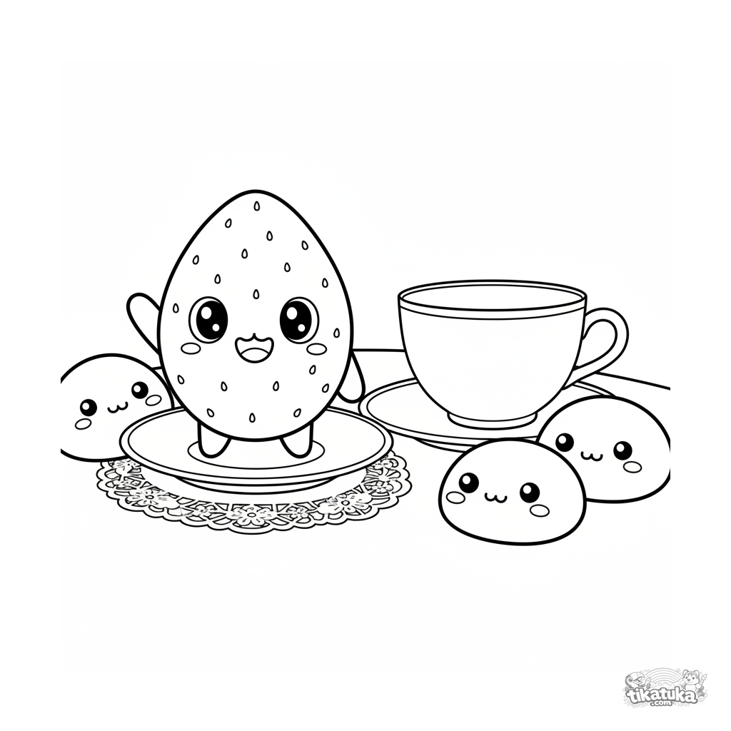 Página para colorir para crianças de 4-6 anos: um mochi de morango sorridente acena de um pires de chá no estilo kawaii.