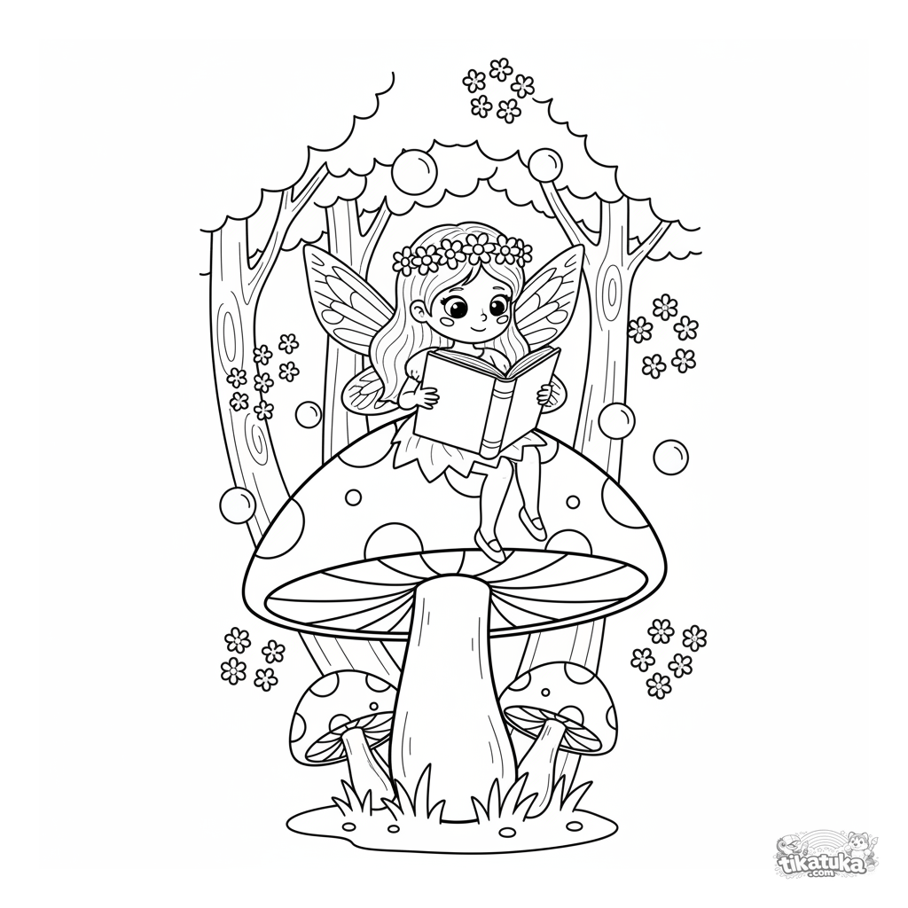 Página para colorir de uma fada lendo um livro em um cogumelo gigante. Para meninas de 4 a 6 anos. Estimula a criatividade.