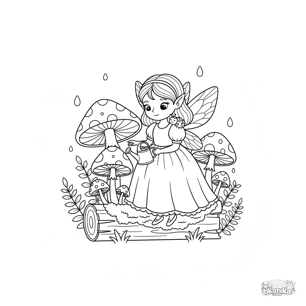 Página para colorir para crianças: uma princesa fada cuida de cogumelos brilhantes em uma floresta encantada. Dificuldade média, perfeita para meninas de 5-7 anos.