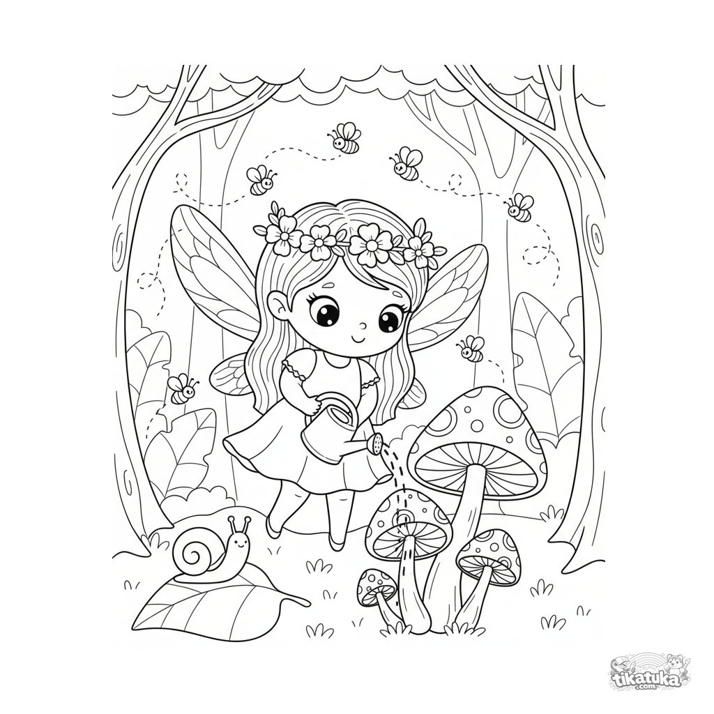 Página para colorir para meninas com uma princesa fada regando cogumelos brilhantes em uma floresta encantada. Para crianças de 4 a 6 anos.