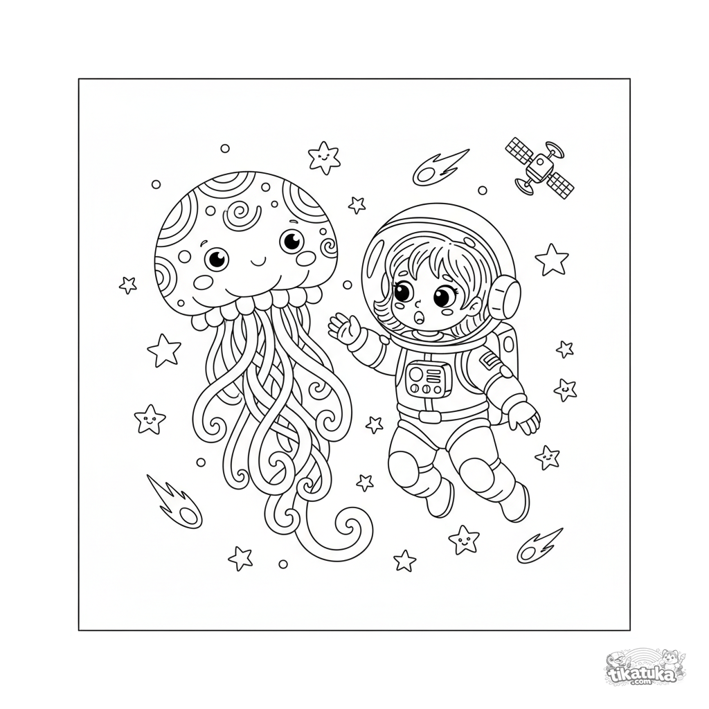 Página para colorir para meninas de 6 a 9 anos: uma menina astronauta encontra uma água-viva gigante e amigável no espaço sideral. Cena cheia de maravilhas.