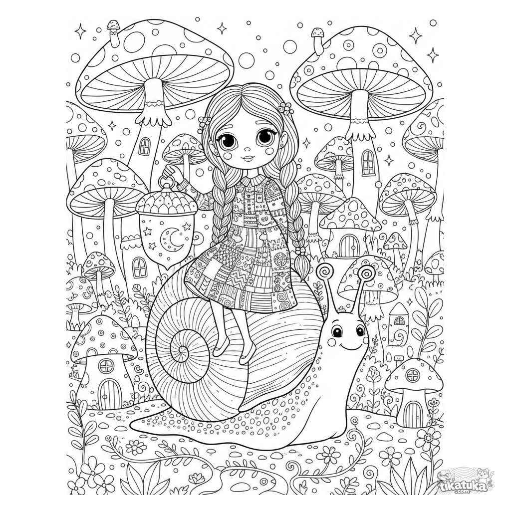 Página para colorir de uma menina montando um caracol gigante numa floresta de cogumelos brilhantes. Para crianças de 6 a 9 anos. Cena mágica.