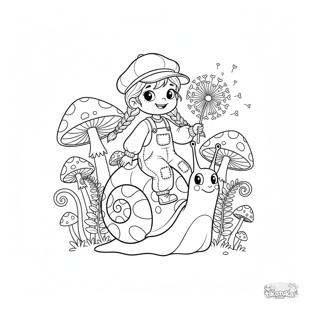 Página para colorir para meninas: uma menina alegre em macacão monta um caracol gigante por uma floresta de cogumelos mágica. Para crianças de 5 a 8 anos.