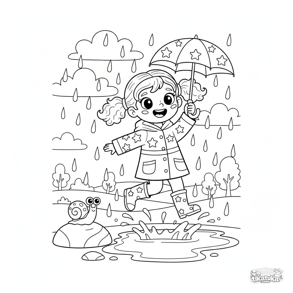 Página divertida para colorir de uma menina feliz de capa de chuva pulando em poças. Para crianças de 3 a 6 anos. Linhas simples, margens amplas.