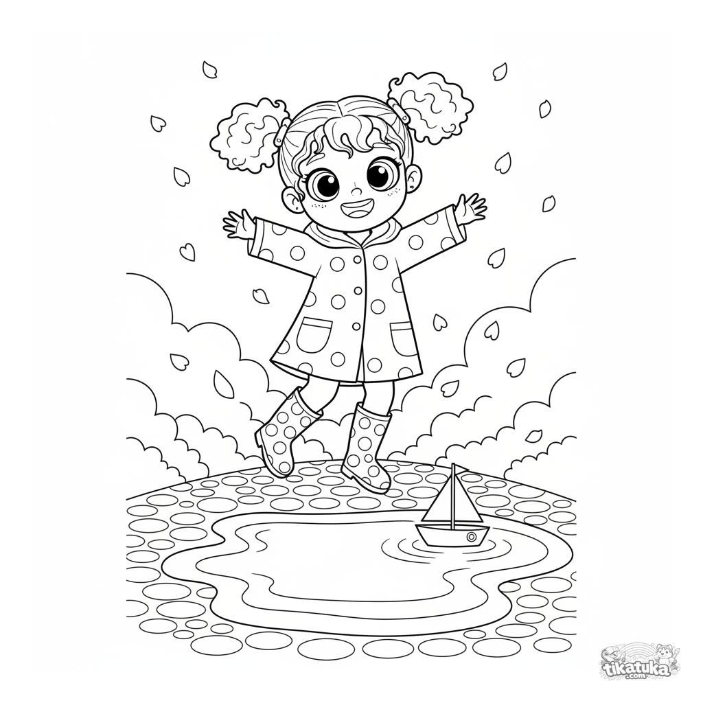 Página para colorir para meninas: uma menina alegre de capa de chuva pula sobre uma poça de primavera. Para crianças de 3 a 6 anos. Pétalas de cerejeira flutuam ao redor.