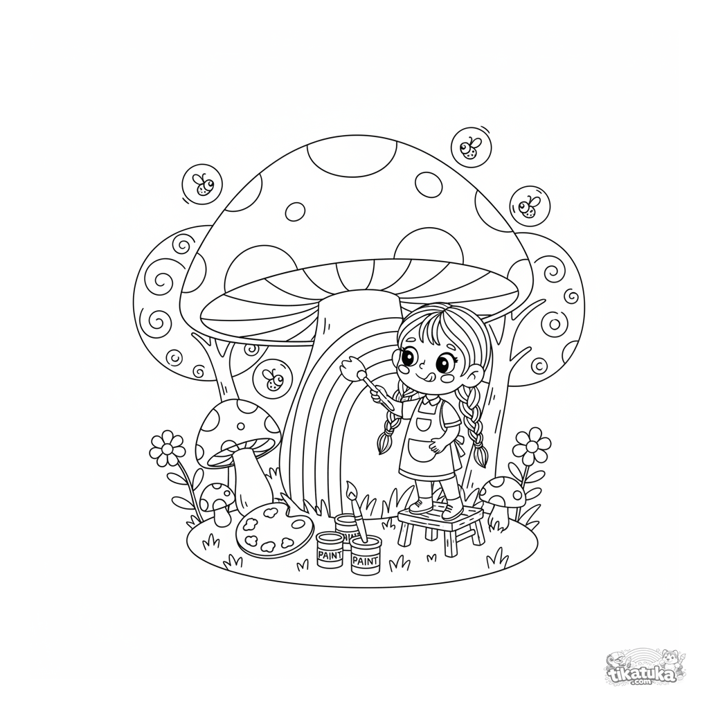 Página para colorir de uma menina pintando um arco-íris em um cogumelo gigante em uma floresta encantada. Para crianças de 5 a 8 anos.