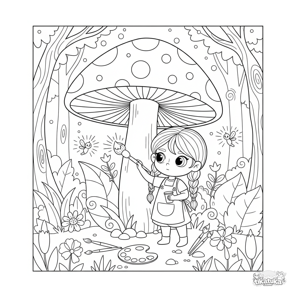 Página para colorir de uma menina pintando um cogumelo gigante em uma floresta encantada. Para crianças de 5 a 8 anos. Cena mágica cheia de detalhes.