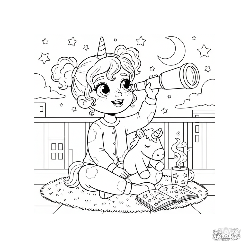 Página para colorir para meninas: uma menina caprichosa em pijama de unicórnio observa as estrelas com um telescópio em uma varanda. Para crianças de 5 a 8 anos.