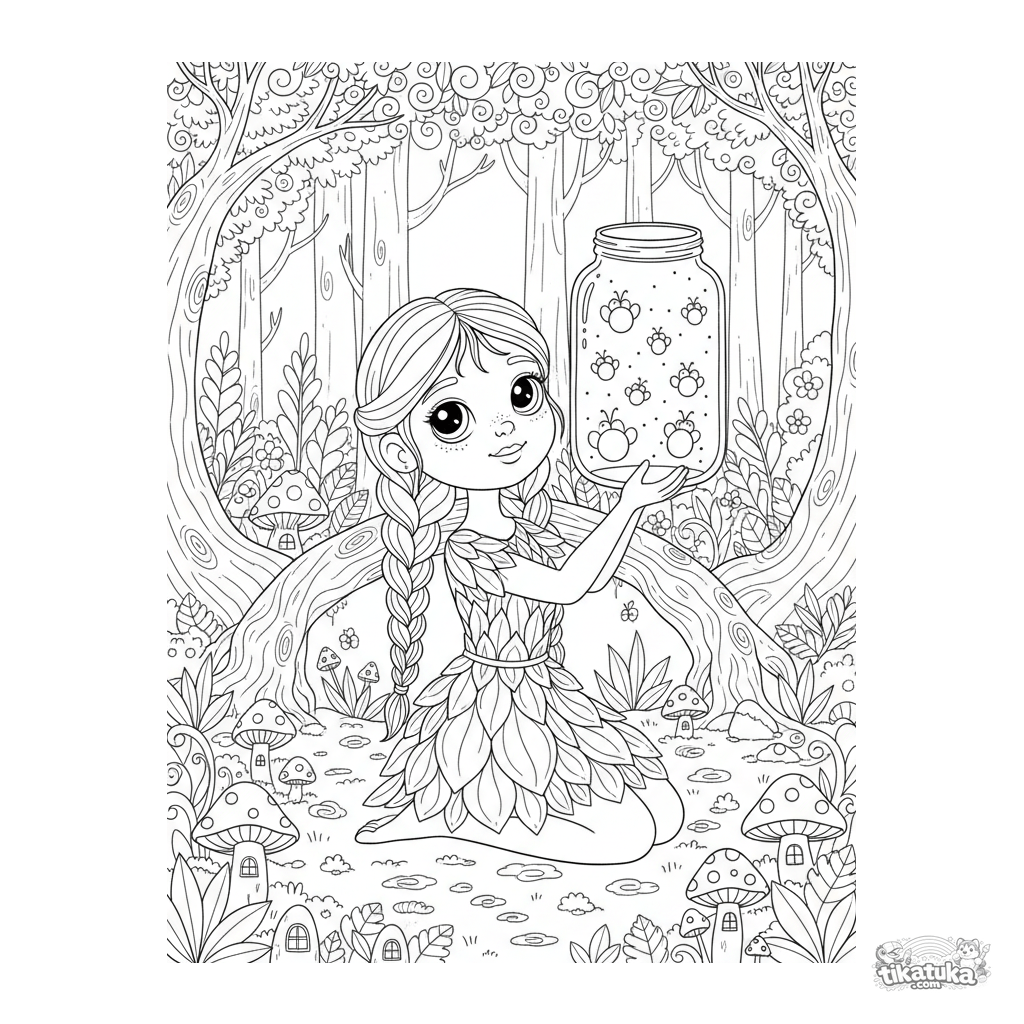 Página para colorir de uma menina em uma floresta encantada. Para crianças de 6 a 9 anos. A menina com vestido de folhas segura um pote de vaga-lumes.