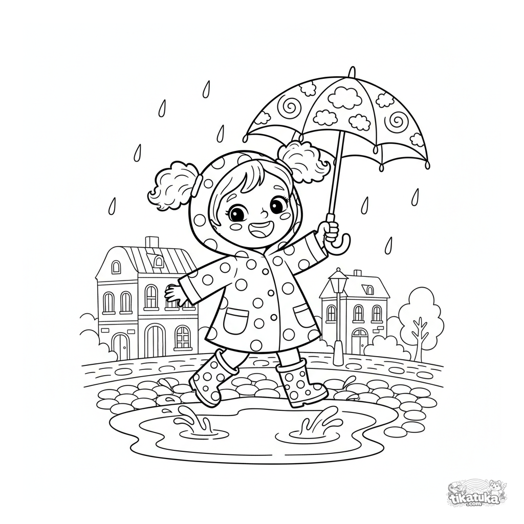Página para colorir para crianças 5-7: uma menina alegre com capa de chuva pula em uma poça com um guarda-chuva arco-íris. Cena ativa com detalhes equilibrados.