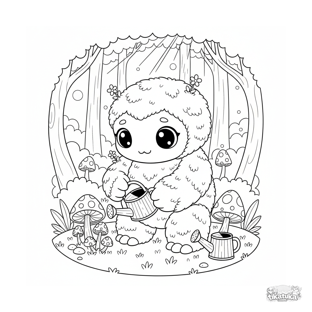 Página para colorir para crianças 4-6: um golem de musgo amigável cuidando de cogumelos brilhantes em uma floresta encantada. Cena de fantasia pacífica.