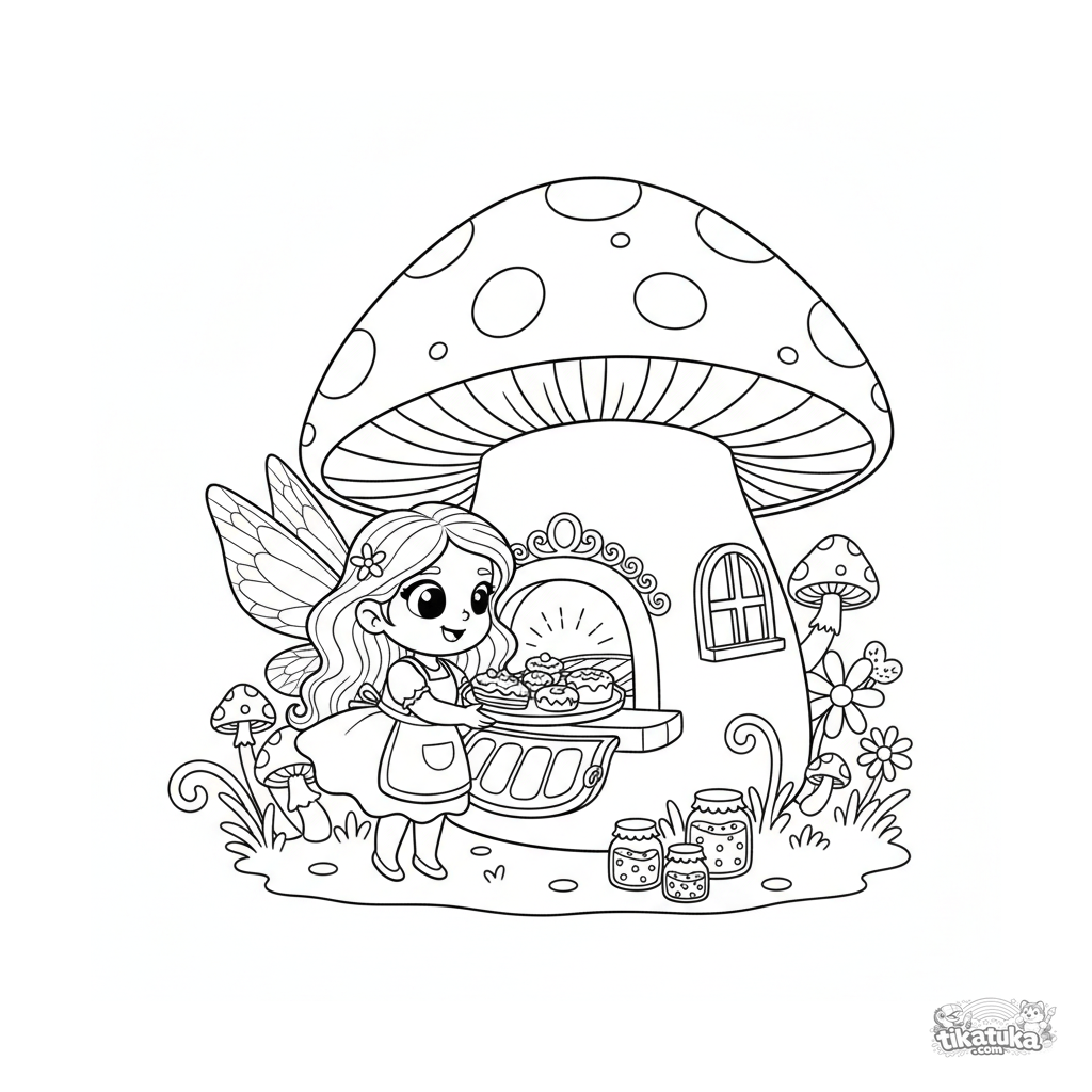 Página para colorir para crianças 4-6: uma fada assando doces mágicos em uma casa-cogumelo aconchegante. Cena fofa com detalhes para colorir.