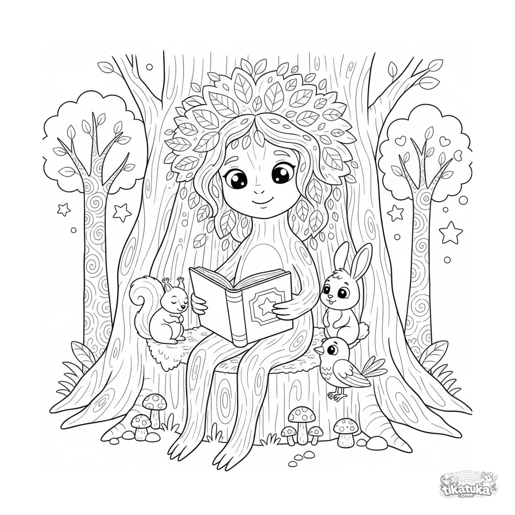 Página para colorir para crianças 4-6: uma amigável árvore-ent antiga lê um livro gigante para um esquilo, um coelho e um pássaro em seu oco aconchegante.