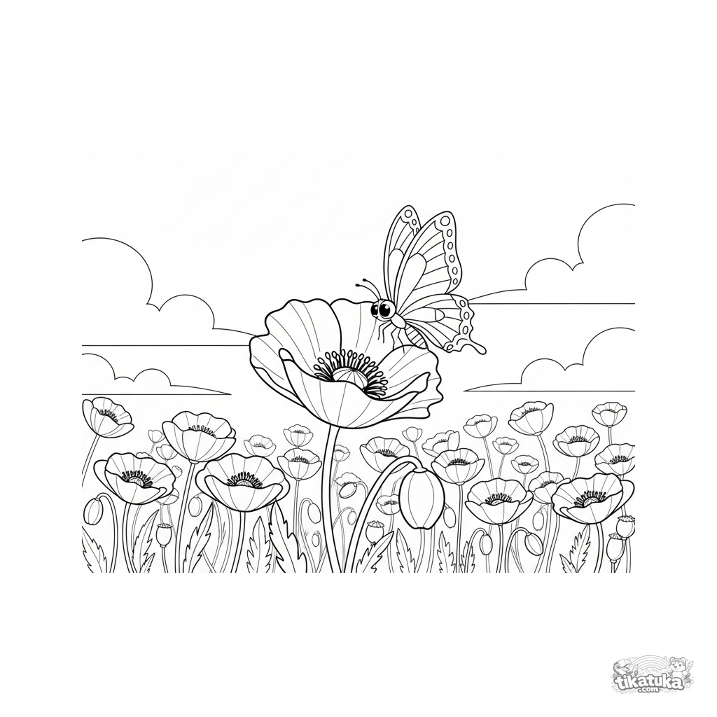 Página para colorir para crianças de 4 a 6 anos: um campo de papoulas ao pôr do sol com uma borboleta. Cena bonita e simples.