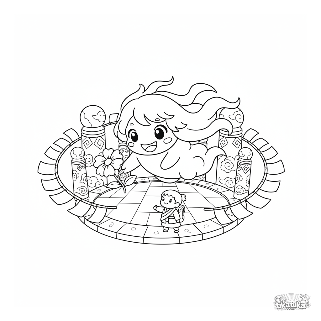 Página para colorir para crianças de 5-9 anos: um espírito do vento alegre ajuda um viajante em um antigo templo da montanha. Linhas dinâmicas e cena positiva.