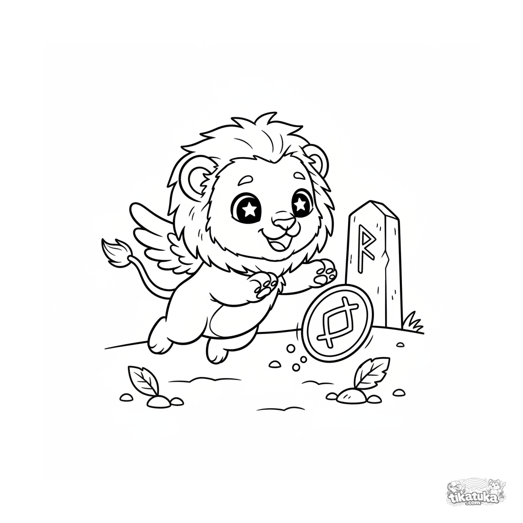 Página para colorir para pré-adolescentes 7-9: um fofo filhote de leão alado em pleno salto tenta pegar uma runa mágica brilhante que flutua livre de um antigo monólito. Cena dinâmica e mágica.