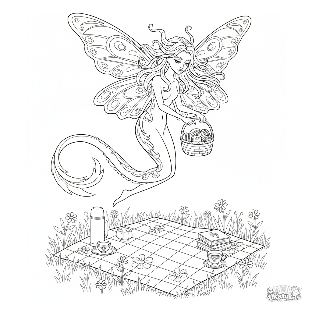 Página para colorir complexa no estilo art-nouveau para crianças de 10-12 anos: um monstro alado elegante entrega macarons em um piquenique.