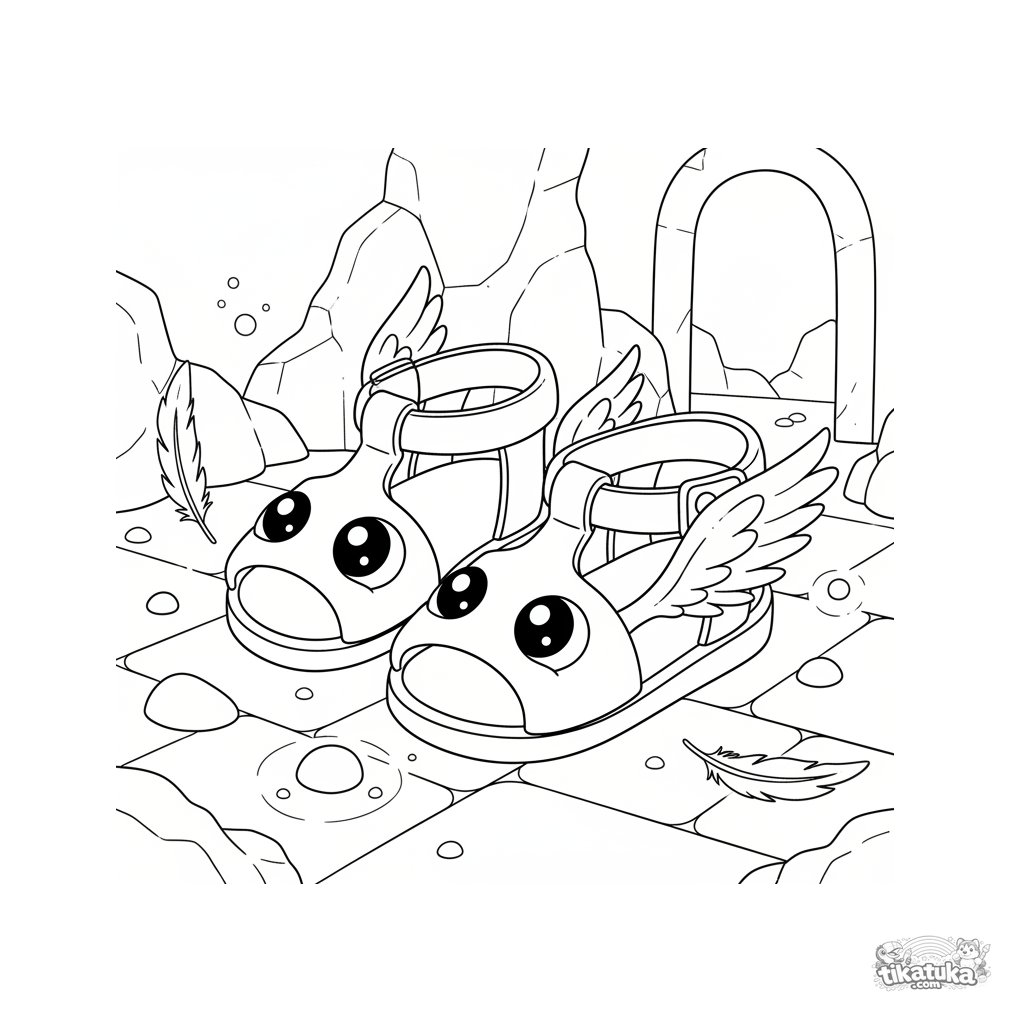 Página para colorir para crianças de 4-6 anos: sandálias aladas mágicas no chão de pedra da toca da Medusa. Contornos limpos em estilo de recorte de papel.