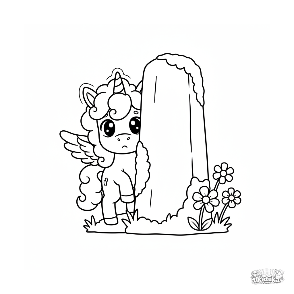 Página para colorir para crianças pequenas: um adorável potro de unicórnio alado espreita timidamente por trás de um antigo monólito. Contornos muito simples e grandes.