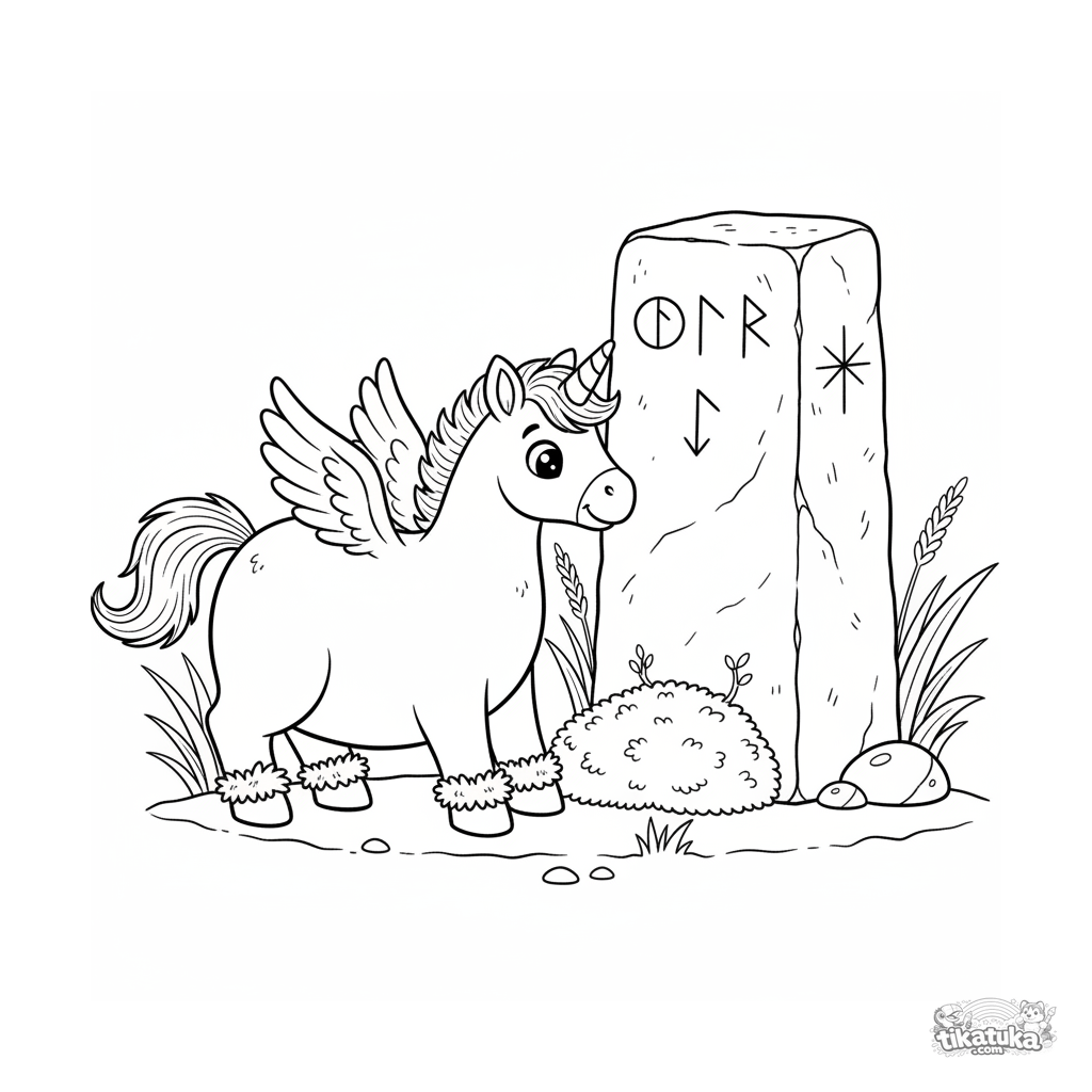 Página para colorir para crianças 4-6: um adorável potro de unicórnio alado explora com curiosidade o musgo na base de um antigo monólito rúnico.