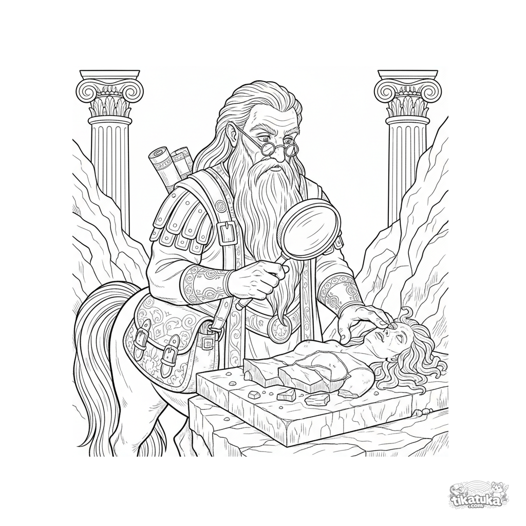 Página para colorir para crianças 10-12: um sábio centauro velho no covil da Górgona estuda fragmentos de uma estátua petrificada com uma lupa. Cena detalhada em estilo de gravura vintage.